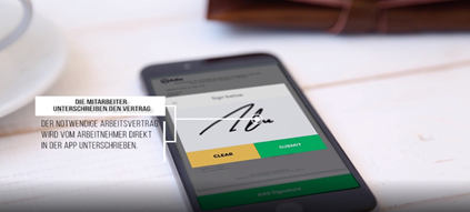 Wenn du ein Job-Angebot angenommen hast und das Unternehmen dich einstellt, unterschreibst du den Arbeitsvertrag ganz einfach direkt in der App – unter dem Menüpunkt „Jobs“ bei „Einsätze“ per Unterschrift mit dem Finger.